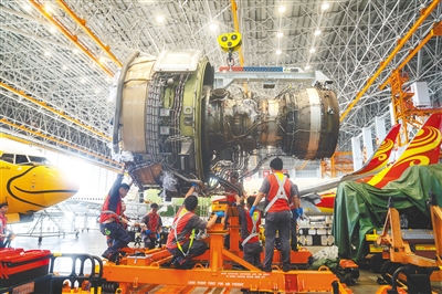 ①在海南自贸港一站式飞机维修产业基地,海航技术旗下大新华飞机维修服务有限公司机务维修人员正在检修飞机。今年1月—7月,海口空港综合保税区共承接33架次飞机入区开展保税维修,货值172亿元,较去年同期增长6.7倍。