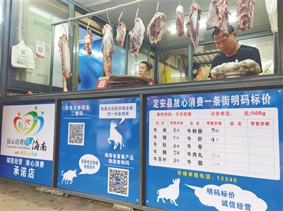 针对不强制要求张贴营业执照的新鲜牛肉销售摊位,定安则统一制作发放明码标价牌,统一张贴展示市场主体信息二维码、海南省禽畜产品溯源查询码等。“我们要求所有价格在标价牌上注明,价格如有调整,须实时修改。”定安县市场监督管理局有关负责人介绍,通过扫描两个二维码,消费者可以第一时间知晓牛肉是否通过检疫检验,便捷查看市场主体基本信息、信用公示、处罚信息等信用信息,打造出“随时随地手机查、商家二维码上知”的消费安全新场景。
