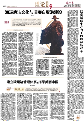 建设中国特色自由贸易港,是习近平总书记亲自谋划、亲自部署、亲自推动的重大国家战略。清廉既是中国特色自由贸易港建设的题中应有之义,同时也是重要政治保障。任何一种精神文化都具有引导、规范、约束人们思想行为的作用。海瑞廉洁文化不但包含着古代清官的高尚品格和浩然正气,还包含了种种廉政制度规范,传承和发展海瑞廉洁文化,不仅对贪腐等不良风气起到一定的遏制作用,也有助于形成自贸港清廉的社会风气。