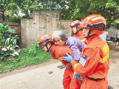 ③ 9月5日,在海口市美兰区灵山镇南调村,国家消防救援局海南机动队伍消防救援人员协助转移行动不便的老人。
