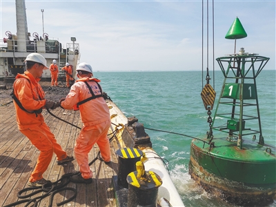 受11号超强台风“摩羯”严重影响,作为重点水域的琼州海峡航道上的航海保障设施受到不同程度的影响和损坏。经过航标人员连续两天一夜的奋战,截至9月8日10时,琼州海峡航道上的航标等航海保障设施已基本得到修复。图为9月7日,专业航标工程船“海巡172“在琼州海峡开展巡检抢修航海设施工作。