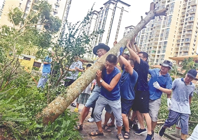 9月8日,在海口市五源河公寓小区,业主自发加入志愿者队伍,参与清理倒伏树枝,清扫垃圾,重建家园。