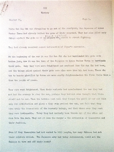 原来,《四世同堂》的结尾并不是钱默吟先生和祁老人战后重见,祁老人要搞庆祝活动。小说的结尾是钱先生登载在报纸上的长篇悔过书。悔过书里没有风景描写,只有对日本军国主义的控诉、批判,对战争的反思,以及对普遍人性的想象。如果删了钱先生的悔过书及小说中相关联的反对战争的细节,就会影响《四世同堂》整体的伦理道德分量和思想面貌,小说的厚重感,老舍先生面对战争创伤犹近在咫尺的现实感,都会被极大地削弱。