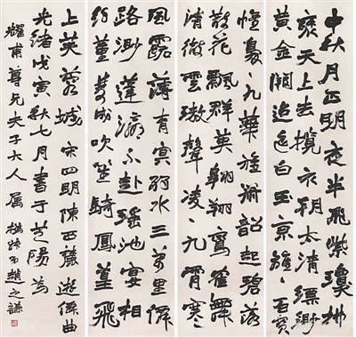 《中秋诗四屏》为行书,方圆笔法并用,以帖的圆融笔法为主,兼入碑的方切用笔,形成了圆中带方的用笔特点。作者下笔时饱蘸浓墨,达到了沉重酣畅的书写效果;行笔时一改帖学瘦劲、清秀、流美的手法,少提笔,多铺毫。行笔速度舒缓,通篇尖笔极少,基本以藏锋为主,线条紧致,浑厚又富有韧性。为了突出浑厚的特点,赵之谦践行了邓石如“疏可走马,密不透风,计白当黑,奇趣乃出”的理论,书写过程中兼用枯笔,以丰富墨色变化,表现书写节奏的跌宕起伏。《中秋诗四屏》还有一个颇具特色的笔法处理方式:为了体现横势,有意将线条横向撑开,在长线的行笔中,如捺笔,一波三折或用圆笔进行书写。