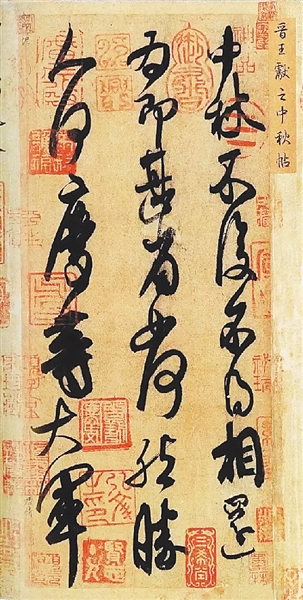 《中秋帖》因卷首有“中秋”二字得名,为东晋书法家王献之所书,是其“一笔书”的代表作。这件作品现仅存3行22字,全文无标点,也没有落款,如何断句引发人们的无尽遐想。此帖是否为王献之真迹存在争议。据考,此帖是用竹料纸书写的,这种纸东晋时尚不能制造,北宋时方出现。清人吴升在《大观录》中说:“此迹书法古厚,墨采气韵鲜润,但大似肥婢,虽非钩填,恐是宋人临仿。”不少人推测:此帖为北宋摹本,很可能是米芾从王献之《十二月帖》中节临的。尽管如此,此帖依旧极其珍贵,是一件难得的书法精品。此帖上有明代书法家董其昌、清代乾隆皇帝等人的题跋,且卷前卷后及隔水钤处有宋代至清代的多枚鉴藏印章。