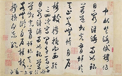 米芾是中国北宋书法家、画家、书画理论家,与苏轼、黄庭坚、蔡襄合称“宋四家”。米芾任涟水(今江苏境内)军使期间,经常登临海岱楼,眺望淮河入海的壮观景色。《中秋诗帖》正是他中秋节登海岱楼赏月后书写的一件草书作品。此帖篇幅不长,米芾托物言志,感怀自己仕途坎坷曲折,一身才华无法施展。