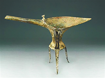 青铜爵的作用相当于现在的酒杯,常见器形为圆腹或方腹,口部有倒酒的流槽,后部有尖尾或圆尾,下有长足。收藏于河南洛阳博物馆的夏代乳钉纹铜爵是迄今我国发现最早的完整青铜酒器之一,爵身呈“细腰瘦腹”状。商周时期的青铜爵厚重古朴,通常有乳钉、云雷、蕉叶等纹饰。爵上有两根短短的立柱,意在提醒饮酒之人注意仪态、浅尝辄止。
