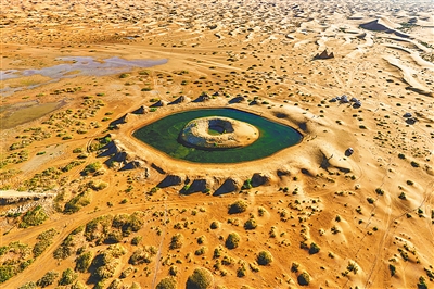 沙漠之眼,位于腾格里沙漠的中部,是一处人工湖。湖泊因其独特的地理位置和形状,湖水碧绿,整体呈环形分布,中间有处沙洲岛,其形状就像是一只眼睛。