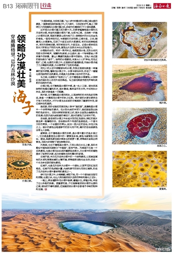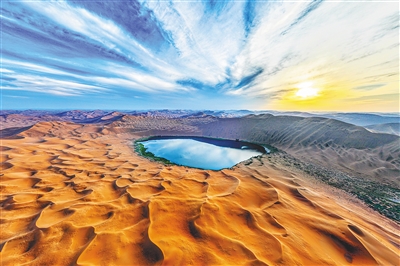 沙漠是动态的。有时一阵风吹过,卷起层层沙浪,且发出低沉而悠长的呼啸声。随着车轮滚滚,沙丘起伏,每一个转弯都给人带来意外的惊喜。最让人震撼的就是沙漠中的湖泊。当地人将这里的湖泊称为“海子”。独特的沙漠景观,本就令人心旷神怡,而在这粗犷、辽阔、壮美的大漠之中,这些湖泊的晶莹剔透,则给沙漠点缀了几分精致和柔美,为沙漠带来了生机和希望。