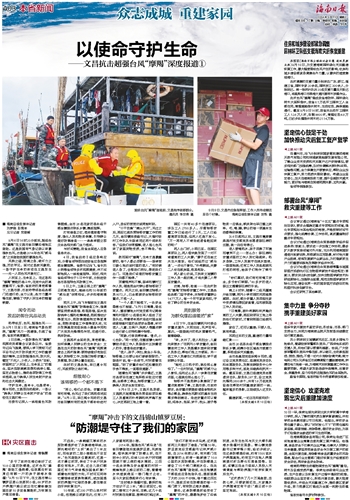 “多亏了政府在海边修好了这10.8公里的防潮堤,这次台风‘摩羯’登陆又逢涨潮,但我真没听说周边有哪一户的房子被海水倒灌!”9月10日下午,在文昌市锦山镇罗豆居山良居民小组,68岁的水产养殖户施云波正在忙着修缮加固自家10多亩鱼塘堤坝,为恢复生产做足准备。