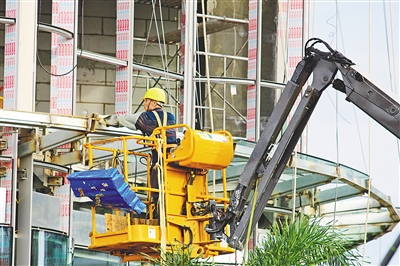 9月11日,三亚中央商务区月川单元建设项目工地,工人在进行大楼内外装修。目前,三亚中央商务区重点项目已恢复正常建设。