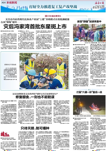 “收鱼来了!收鱼来了!”9月12日下午4时许,随着东星斑收购商詹孝生的声音由远及近,文昌市冯家湾现代化渔业产业园(以下简称冯家湾产业园)鲲诚现代海水养殖创新产业园车间里热闹起来。这里“上楼”养殖的东星斑,安全度过了超强台风“摩羯”的袭击,要“下楼”上市了。