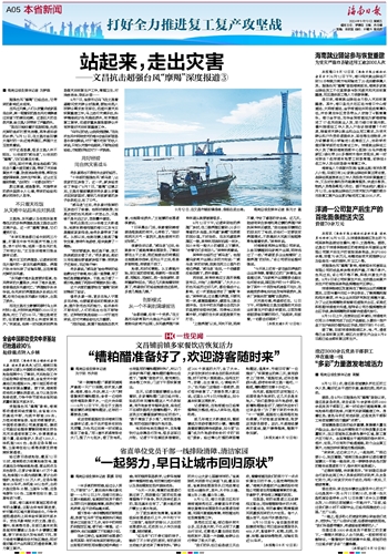 好在,面对灾情,我省各级部门和社会力量火速支援文昌,带来了灾后修复技术力量、防疫消杀物资等,帮助加速家园修复、加快生产恢复。这让王玉感到欣慰,“会好的!一切都会好的!”
