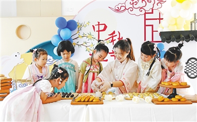 图为9月12日浙江省台州市仙居县迎晖幼儿园小朋友在老师的指导下学做手工月饼。