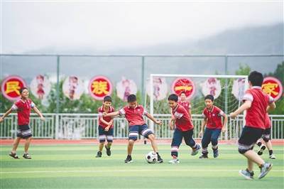 在广西桂林市龙胜各族自治县龙胜镇第二小学,学生们在踢足球。