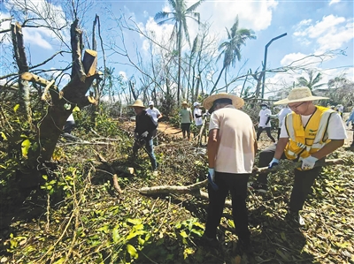 本报讯(海南日报全媒体记者邵长春)9月13日,在中秋节即将到来之际,海南省发展控股有限公司积极响应省委、省政府关于灾后帮扶的号召,调动人员设备力量帮助海口市美兰区演丰镇灾后重建,并送去生活物资及清障设备。当天一大早,在演丰镇,海南控股近200名志愿者集合列队,手持电锯、扫把等工具,投入到镇里垃圾清运、道路清障等工作中,紧急调用的2台翻斗车、1台铲车、1台自卸货车等设备也有序投入灾后重建工作。