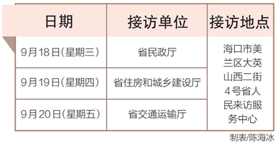 9月18日至20日,省民政厅、省住房和城乡建设厅、省交通运输厅等单位相关负责人将在海口市美兰区大英山西二街4号省人民来访服务中心接访群众。