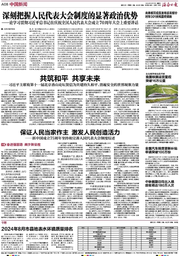 在庆祝全国人民代表大会成立70周年大会上,习近平总书记发表重要讲话,回顾中国共产党领导中国人民建立、完善人民代表大会制度的光辉历程,深刻阐述人民代表大会制度的显著政治优势,系统总结新时代人民代表大会制度理论和实践创新重大成果,对在新的历史起点上坚持好、完善好、运行好人民代表大会制度作出全面部署、提出明确要求。习近平总书记的重要讲话立意高远、催人奋进,丰富和发展了习近平总书记关于坚持和完善人民代表大会制度的重要思想,是一篇闪耀着马克思主义真理光辉的纲领性文献。