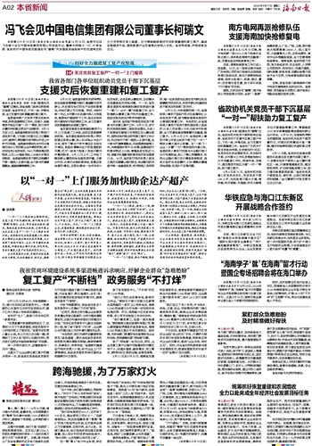 海南欧亿家进口肉类冷链加工基地、峨阳智能生态农场等地实地查看受灾受损及灾后恢复情况。他指出,要加强统筹协调,落实好各项帮扶政策,务实高效解决企业实际问题,发挥农业保险作用,提高农业企业抵御风险能力。在电力恢复、企业融资、扩大生产等方面精准帮扶,帮助园区企业尽快恢复生产施工秩序,把失去的时间抢回来,扎实做好设备检修和安全隐患排查,确保实现安全生产。把灾后恢复重建和产业提档升级相结合,在促产、促销、促融资方面持续发力,全力保障生产要素供应,促进产业发展提质增效。