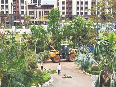 9月7日,南海幸福汇小区物业工作人员在清扫树枝。