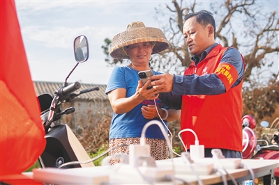 图为村民在工作人员的指导下,用应急电能给电动车和手机充电。