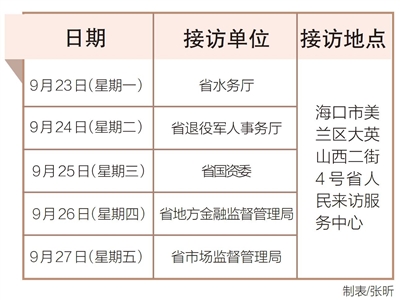 9月23日至27日,省水务厅、省退役军人事务厅、省国资委、省地方金融监督管理局、省市场监督管理局相关负责人将在海口市美兰区大英山西二街4号省人民来访服务中心接访群众。