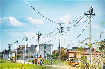 近日,在海口市龙华区新坡镇,来自广州市南沙区的电力工人在抢修供电线路。