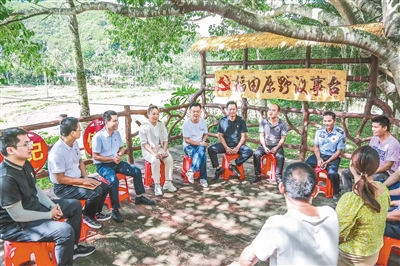 在三亚市育才生态区青法村“稻田原野议事台”,村民围坐一起,就大家关心事畅所欲言。通讯员 刘琪成 摄