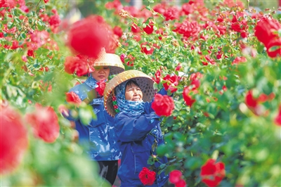 三亚市博后村玫瑰谷,工作人员在花田里劳作。