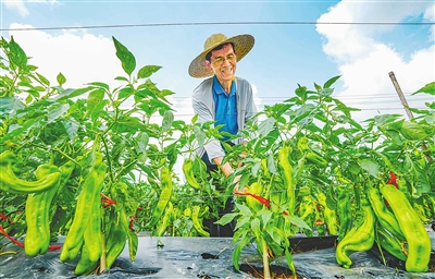 三亚市崖州区国家现代农业(种业)产业园内,育种专家察看辣椒长势。