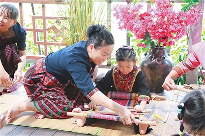 在育才生态区保立村,三亚市级黎锦技艺传承人黄青梅向小朋友教授黎锦编制技艺。