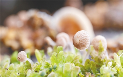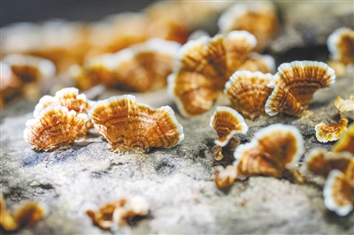 ① 在琼中百花岭热带雨林文化旅游区,生长在木头上的蘑菇。