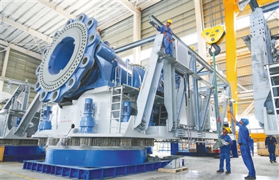 在海南洋浦海上风电产业园一期厂房,工程人员正装配风机主机。海南日报全媒体记者 武威 摄