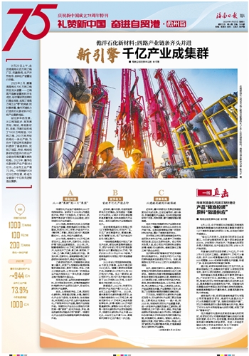 经过多年的发展,从以炼油起步,到发展芳烃、烯烃,再到新材料,目前,洋浦已经形成了1000万吨炼油、100吨乙烯、200万吨芳烃的炼化一体化产能,为向中下游延伸发展新材料提供了基础原料,实现了油品、芳烃、烯烃和新材料四路并行的全产业链协同高质量发展的格局。2023年,儋洋石化新材料产业产值944亿元,占全市工业产值73.9%。今年突破1000亿元已然在望,将成为全省首个千亿级先进制造业集群。