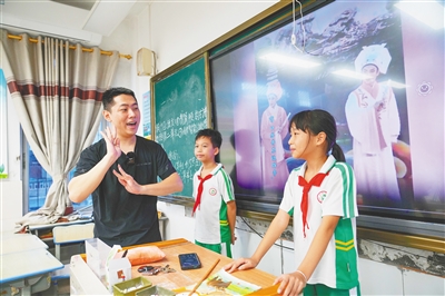 日前,定安县琼剧文化发展有限公司青年演员陈科翰正在教授定安县第三小学学生学唱琼剧经典片段。