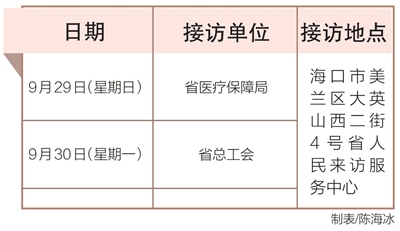 9月29日至30日,省医疗保障局、省总工会相关负责人将在海口市美兰区大英山西二街4号省人民来访服务中心接访群众。