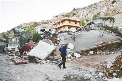 9月27日,在黎巴嫩南部城镇萨巴阿,一名男子查看以军空袭留下的废墟。新华社/法新