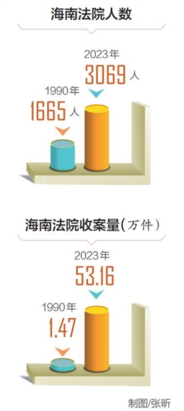 斗转星移,风雨兼程。一路走来,海南法院机构设置在变,办公环境在变,但一代代海南法院人追求“公正与效率”的初心从未改变。2023年,全省法院受理各类案件53.16万件,审执结46.06万件,法官人均结案420件。