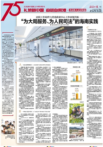 2024年是新中国成立75周年,海南正全面加快建设自由贸易港。海南法院紧紧围绕“努力让人民群众在每一个司法案件中感受到公平正义”工作目标,做实为大局服务、为人民司法,以高质量司法服务保障海南自由贸易港建设和经济社会高质量发展。