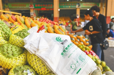 在三亚市吉阳区鸿港农贸市场,商家使用全生物降解塑料袋销售水果。