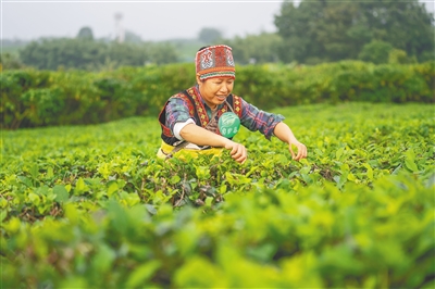 在白沙黎族自治县原生态茶园小镇,农户采摘早春茶。