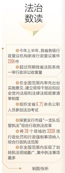 法治建设主体责任再压实——抓紧抓实党政主要负责人述法工作,推动“关键少数”挑起“法治担子”;在全国范围内率先出台实施意见,建立领导干部应知应会党内法规和法律法规规章清单制度,组织全省6万余名公职人员参加法治考试。