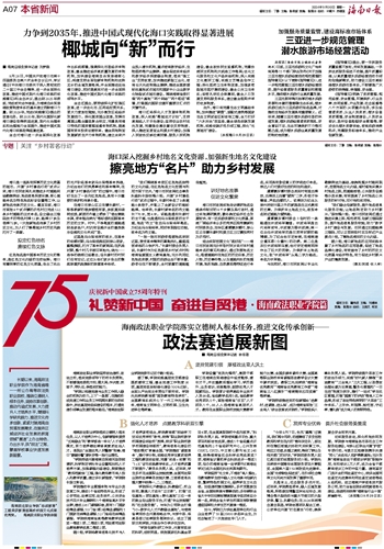 ■ 海南日报全媒体记者 林佳蓓长期以来,海南政法职业学院作为海南省唯一一所公办高等政法类职业院校,围绕立德树人根本任务,坚持改革创新,推动内涵式发展,大力提升人才培养水平,增强科学研究能力,推进文化传承创新,紧紧对接海南自贸港发展需求,在服务区域经济社会发展的教育领域“赛道”上办出特色、办出水平,执“政法”之笔,擘画学校事业快速发展新图景。