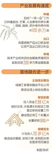 ——全产业链日益健全:引种榴莲等新奇特果蔬,布局深海网箱养殖项目,在全省建设热带特色高效农业生产基地,种植芒果、荔枝、菠萝等热带水果60多万亩,种植茶叶、咖啡、胡椒等作物60多万亩,茶业科技城等现代化加工园区纷纷落地,发展思路不断升级,重点项目遍地开花,农业现代化产业体系呼之欲出,产业支撑作用不断加强……