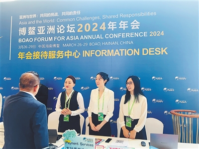建行海南省分行员工在博鳌亚洲论坛年会主会场人民银行统一设立的支付服务咨询点为客户服务。