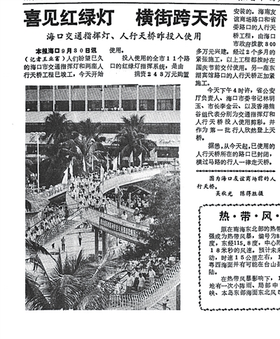 你知道海口什么时候开始有红绿灯和人行天桥吗?1989年9月30日,海口首批11个路口的红绿灯系统和友谊商场路口、省委路口(今海府路老省委门口)两座人行天桥投入使用。次日,《海南日报》第三版刊发了消息《喜见红绿灯 横街跨天桥》,配发了友谊商场前人行天桥的图片。
