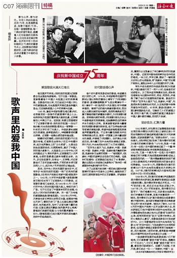 歌为心声,歌为时代。中华人民共和国走过的75年,也是高歌猛进、弦歌不辍的75年。在每一首爱国歌曲、每一个跳动的音节背后,都藏着人们对祖国的无限热爱,以及对未来的美好希冀。在庆祝中华人民共和国成立75周年的重要节点上,这些歌曲仿佛穿越时空,以更为鲜活的姿态讲述着属于中国的动人故事。