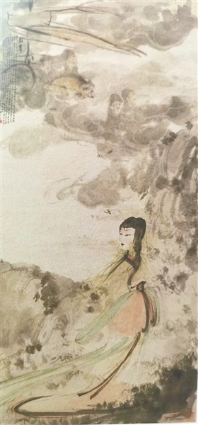 傅抱石对中国画的研究并没有停留在理论上,而是秉承传统文化精神,把中国画理念行使在人物画和山水画的实践中。自上个世纪三四十年代开始,他画了许多取材于古人或仕女的人物画。其作品《山鬼》就是其中的代表,构图与笔墨表现都依据传统中国画法则,对人物形象和衣饰细节的描绘则具有浪漫主义特点。画面表现境界高古,灵动感人,既体现出傅抱石对中国传统绘画技艺学习形成的绘画风格与审美观,又能够在绘画实践中以现代绘画表现的形式美凸显创作主题。而且,他笔下的人物不以甜俗为美,画中笔墨、线条随形而为,表现出人物的性格,因此,他的仕女人物作品成为具有现代绘画形式美的中国传统仕女图的典范。