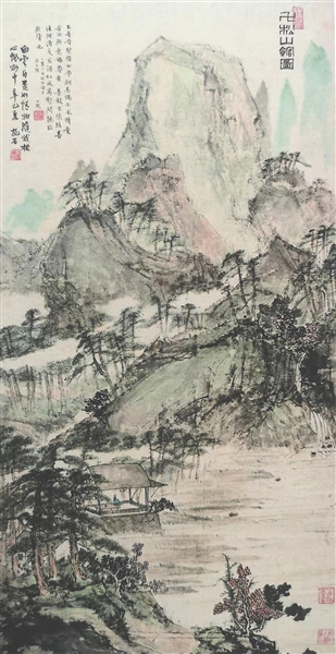 事实上,傅抱石在山水画上更倾心于石涛,追求诗意,崇尚自然。早年的《万松山馆图》就是循着石涛诗意创作的绘画。画幅中,山峰叠嶂,松林蓊郁,有一位蓝衣高士独坐水榭,静听山水之间的天籁之音。这个形象很契合石涛画诗的描绘,表现出沉稳、扎实的传统绘画功力。其画中树木山石无不以传统勾、皴、染、点为法则,笔墨形式简练,诗境灵冥,让画面神似石涛。而后来的《听泉图》则以“听泉”为绘画主题,画面随着饱含情感的笔墨挥洒,以“皴水法”“破笔法”“扫雨法”形成“抱石皴”(傅抱石独特的绘画技法)笔法,展现出一个融自然与自我为一体的绘画世界。而在此画幅中,左上和中部右端两组瀑布和近景流泉形成水系呼应,中间隔以巨石深壑和茂林茅亭,使水系时隐时现,形成动感,静动山涧,烟雾腾腾,雨、雾、泉、水等鲜活场景在他的笔下翻滚,与近景浓墨破笔点画出的巨石茂树,拉开前后层次,丛拥着寥寥数笔勾画出的草屋水榭,一位骚客依栏眺望,画面意境深远。画家笔下的这个听泉瞬间,真有宋代诗人黄非熊诗中“万濑澄空天地秋,清音不断下悠悠”的感觉。而在画幅的右上方,则是诗书流连,诗书画构成一个完整的诗意空间。这种绘画模式,让傅抱石更便于传达细腻、准确的情感,显示出他的中国画风格已经成熟。