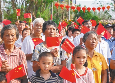 10月1日上午9时整,文昌市锦山镇锦华村厚禄村,昂扬激越的《义勇军进行曲》旋律响起,70岁的“老旗手”陈奕喜将攥在手里的国旗扬向空中。